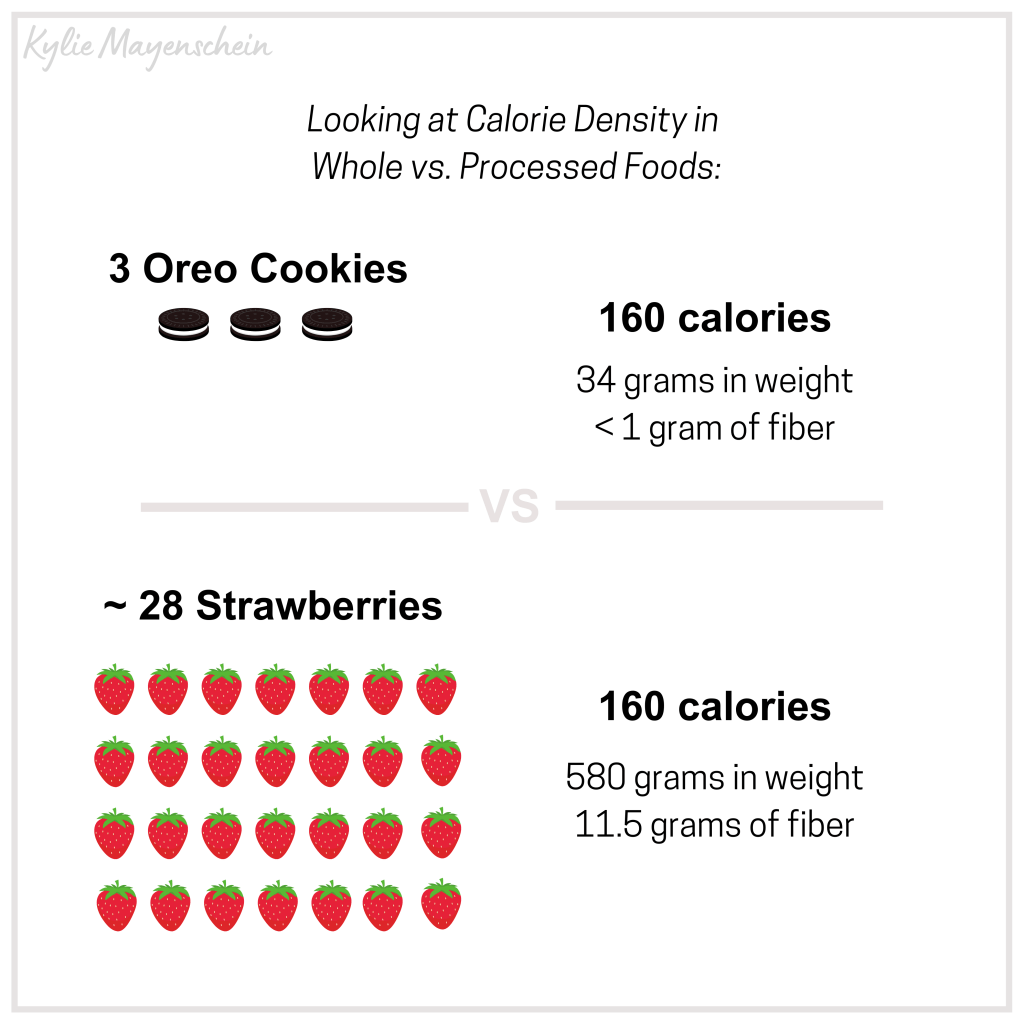 Let’s look at an example of a whole food versus a processed food: strawberries versus Oreo cookies. One serving of Oreos is generally three cookies for approximately 160 calories. Meanwhile, you would need to consume about three and a half cups of strawberries, around twenty-four large strawberries, to reach those same 160 calories. That would be about 580g of strawberries, and only about 34g of Oreos.